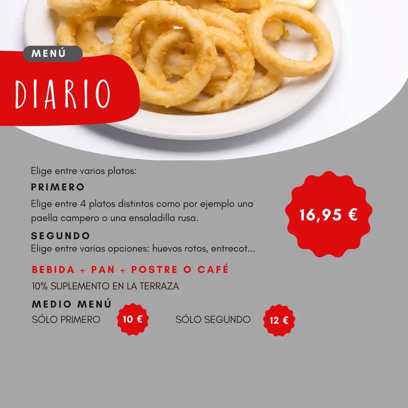 - Nuesta especialidad: huevos rotos. Clásicos con patata, con salsa brava, con setas...